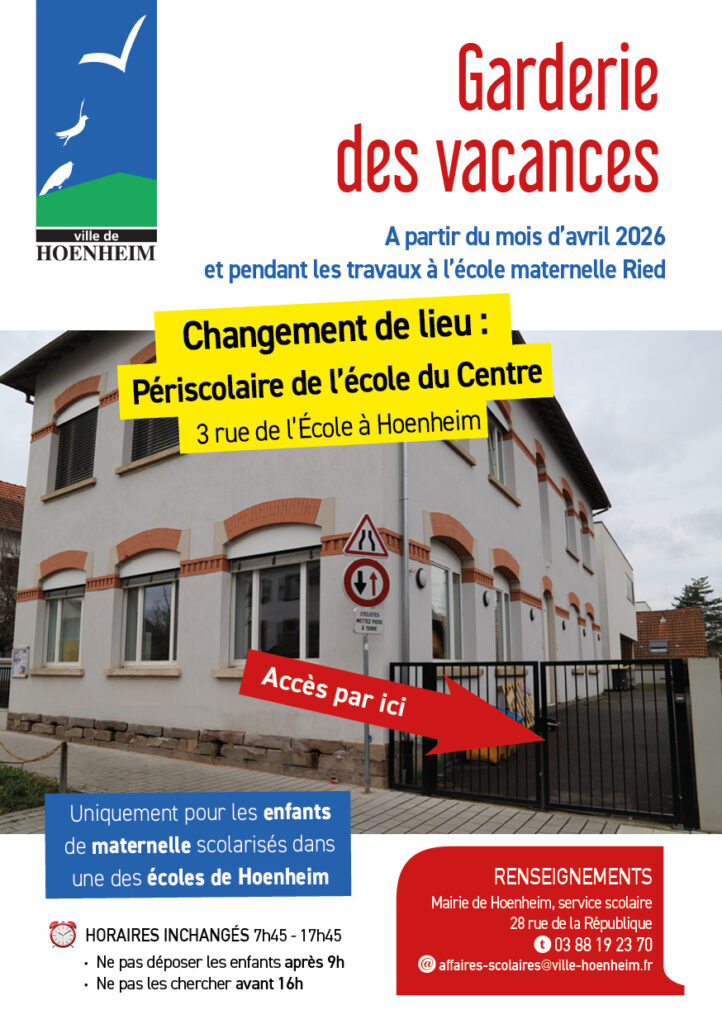 ATTENTION ! CHANGEMENT DE LIEU POUR LA GARDERIE DES VACANCES À PARTIR D’AVRIL 2026 ET PENDANT LES TRAVAUX A L’ECOLE MATERNELLE RIED : NOUVEAU LIEU DE LA GARDERIE DES VACANCES POUR LES 3-6 ANS A compter du lundi 13 avril 2026, la garderie des vacances se déroulera au Périscolaire de l’école du Centre – 3 rue […]