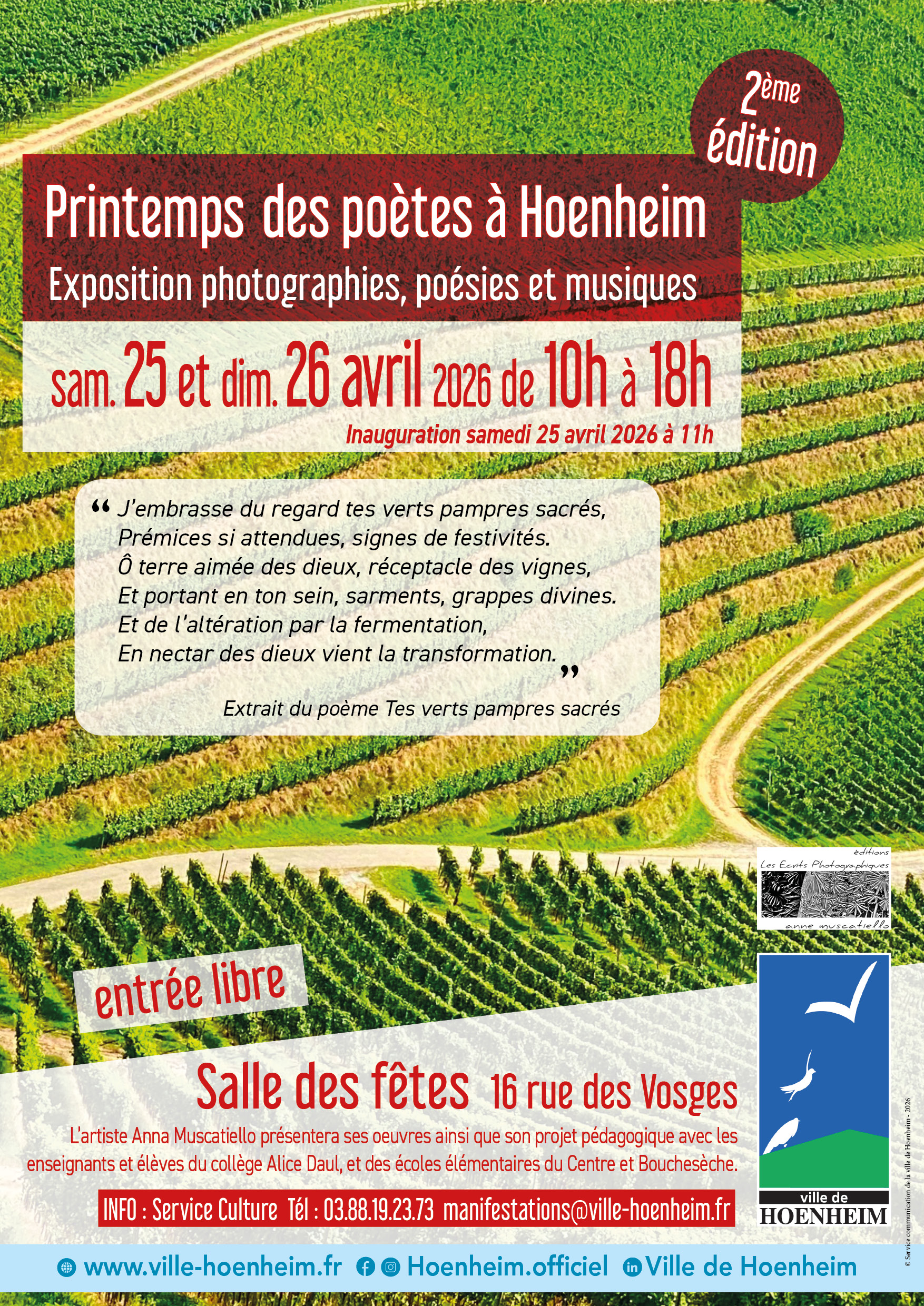 Pour la deuxième édition du Printemps des Poètes, la ville de Hoenheim accueille une exposition exceptionnelle mêlant photographie, poésie et musique, orchestrée par l’artiste Anna Muscatiello.