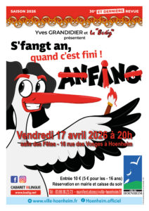 📅 Vendredi 17 avril 2026🕗 20h00📍 Salle des Fêtes de Hoenheim Après 30 ans de succès, le célèbre cabaret alsacien La Budig fait étape à Hoenheim pour présenter, une dernière fois, sa 30ᵉ et ultime revue 2026 : S’fangt an quand c’est fini ! Depuis 1995, Yves Grandidier & La Budig ont conquis près de 130 000 spectateurs à travers plus de 600 représentations en Alsace, en Moselle, à Paris et jusqu’à Stuttgart.Leur marque de fabrique : un cabaret bilingue,…